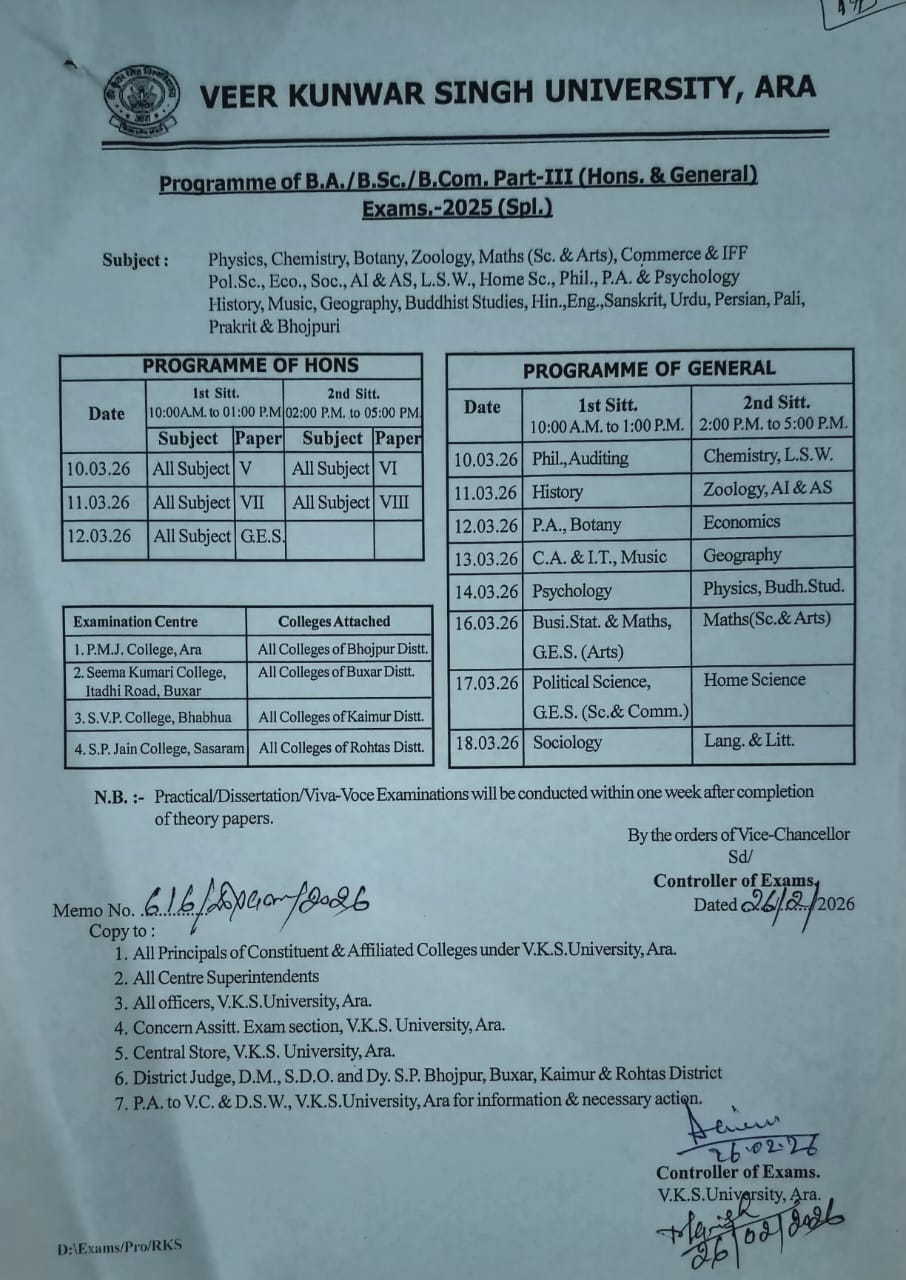 VKSU: वीर कुंवर सिंह यूनिवर्सिटी आरा के परीक्षा विभाग के द्वारा सत्र 2022-25 के कला, विज्ञान एवं वाणिज्य सभी विद्यार्थियों का Special Part-3 का परीक्षा रूटीन जारी कर दिया गया…
